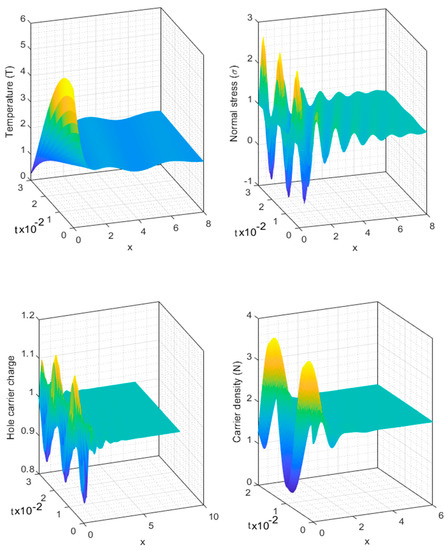 The dimensionless thermal, strain, carrier density, hole carrier charge field, and stress in 1D in the time domain can be computed and graphically depicted using the Riemann sum approximation and numerical inversion of Laplace transform. Silicon (Si), a semiconductor material, may be used in this simulation. The SI unit uses the input parameters of the Si material and the magnetic field parameters, which are shown in the following Table 1 [35,36].
