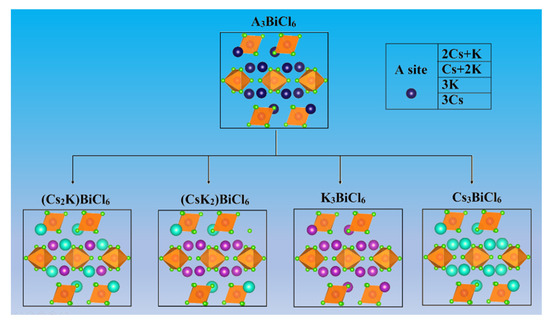 First, we constructed the 0D structures of (Cs2K)BiCl6, (CsK2)BiCl6, and K3BiCl6 through the regulation of the A site (Figure 1). The 0D (Cs2K)BiCl6, (CsK2)BiCl6, and K3BiCl6 are monoclinic crystal structures with space group C/2c, consistent with 0D Cs3BiCl6. In (CsK2)BiCl6, the BiCl63− octahedron is sterically isolated by surrounding Cs+ and K+ atoms. The distance between two adjacent Bi atoms in (CsK2)BiCl6 is approximately 7.71–7.76 Å, indicating almost no interaction between the two adjacent BiCl63− octahedra and the nature of 0D electronic dimensionality [50].