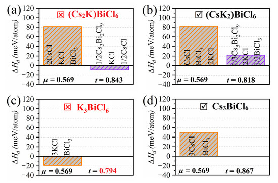 Calculated decomposition enthalpies (ΔHd) of (Cs2K)BiCl6 (a), (CsK2)BiCl6 (b), K3BiCl6 (c) and Cs3BiCl6 (d). The orange bars indicate pathways involving only binary compounds. The violet bars indicate the lowest ΔHd pathways involving ternary compounds. K3BiCl6 and Cs3BiCl6 do not involve decomposition paths for ternary compounds. The Goldschmidt tolerance factor (t) and the octahedral factor (μ) are also indicated, red indicates unsuitable values.