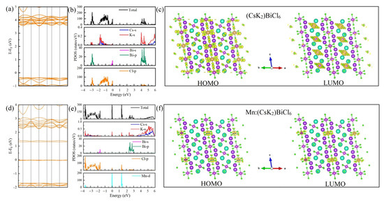 Similar to Cs3BiCl6, the inherent indirect bandgap of (CsK2)BiCl6 may lead to its poor PL performance, limiting its further applications. Previous research results show that doping can effectively tune the electronic structure of materials, and experimentally reasonable doping can improve the PL performance of metal halides [27,53]. As a suitable metal ion dopant, Mn2+ has been widely used to tune the optical properties of semiconductors. Therefore, the electronic structure of (CsK2)BiCl6 after Mn doping was calculated. We constructed an Mn-doped (CsK2)BiCl6 structure by replacing Bi with Mn and optimized it to obtain the most stable crystal structure. Figure 3d–f shows the energy band structure, DOS and charge density of Mn-doped (CsK2)BiCl6, respectively. Compared with pristine (CsK2)BiCl6, Mn-doping produces two impurity states in the forbidden band. Combining DOS, it is found that these two impurity states are mainly due to the contribution of the 3D orbital of Mn. Figure 3f shows the charge density of Mn-doped (CsK2)BiCl6. The results show that the charge density around Mn is higher than that of Bi in both HOMO and LUMO. This is mainly due to the different valence states of Mn2+ and Bi3+, while the high charge density around Mn explains the charge balance of Mn-doped (CsK2)BiCl6.