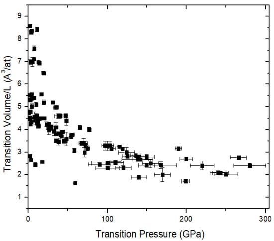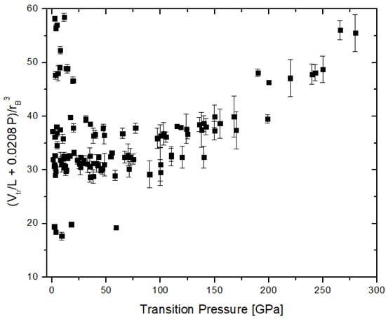 There are two regions in Figure 1 that contain no values Vtr/L: (1) There is no observed Vtr/L equal to or smaller than 1.48 Å3/at at any pressure; 1.48 Å3/at equals 10 times the cube of the Bohr radius (per atom; this limiting value 10 rB3/at is defined here as N1). Upon compression, elemental solids such as Au and Re reach this limit (see Figure 4) but without further known transformations [,]. There is no known elemental solid that undergoes a polymorphic transition between 0 and 300 GPa where the volume at the transition is equal to or smaller than 10 rB3.