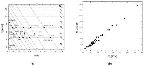 ‘Upward’ and ‘downward’ transitions between different states Ni can be correlated to changes in the valence electron configuration wherever such information has been obtained experimentally [,,] or through calculation [].The fact that the volumes Ni are nearly equal to integer multiples of rB3 has a straightforward theoretical basis: It implies that the volumes that occur at polymorphic transitions of non-molecular elements are controlled by the number of valence electrons rather than by their interactions. Besides the limited experimental accuracy the electron exchange- and Coulomb interactions account for part of the deviations from Equation (1) and from integer Ni values; thus, the interaction terms are of the second order with respect to the volumes. In other words, Equation (1) is the equivalent to an ideal equation of state for elemental solids, only that it does not describe continuous pressure–volume changes but discrete changes that occur at the phase transitions. This finding can be further quantified by considering the effect of the different valence orbital states as based on the experimentally determined pressure-induced hybridization of d-states of the alkaline metals Rb, Cs, and K (the latter element exhibits no measurable d-state occupancy up to 40 GPa) []. Figure 1 may be re-parametrized in terms of pressure-induced changes in the d-state occupancy at the valence level. In particular, the d-state occupancy of the elemental polymorphs can be correlated with the five sets N2 to N6 shown in Figure 1 through their 0 GPa intercepts. This is shown in Figure 3a. For instance, the d-state occupancy of Cs increases for phase Cs-II to -VI from ~0.0 to ~0.6, and for Rb from ~0.2 to 0.4 electrons between Rb-II and -VI []. The high-P polymorphs of Li and Na have little or no occupied d-states in this diagram and according to earlier computational work [,,]. The correlation between Δn(d) and Ni is linear, at least for the polymorphs K-II, Rb-II,-IV, Cs-II, and Cs-III (black squares in Figure 3a): Within uncertainty, the slopes are equal for all sets. In terms of multiples of the electron elemental charge, this linear correlation between d-state occupancy, Vtr, and L is: