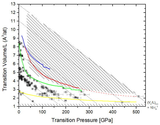 Data from Figure 1 with the equations of state for gold [], chlorine [], hydrogen [], and oxygen [] shown as yellow, green, red, and blue lines, respectively. Dashed lines indicate the distinct sets that defined Vtr/L versus P as defined by Equation (1). The additional data points for hydrogen [] and the second elastic anomaly of osmium [] have been added. Hachured areas mark the molecular gap and the forbidden zone below Vtr/L = 10 · rB3.