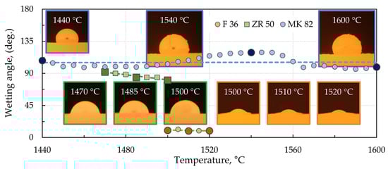 Since high-alloy manganese steel showed a severe interaction at the interface with the investigated ceramic material, only three temperature dependencies of the contact angles are selected in Figure 2, namely, with the basic fireclay material F36, the zirconia material ZR50, and the high corundum material MK82. The most pronounced interaction is observed at the interface with the material designated F36, with an apparent wetting angle of only about 10° at temperatures around 1500 °C for this material with manganese steel. In the case of zirconia material ZR 50, the apparent wetting angle at the same temperature is 80°, and that of MK 82 is 103°. Though the temperature dependencies of the wetting angle were investigated up to a maximum temperature of 1600 °C, not all the angles could be adequately evaluated. Therefore, only the evaluable sections are shown in Figure 2, including images of the recorded droplets at the specified temperatures. A discussion regarding the interaction at these phase interfaces is given in Section 3.3.