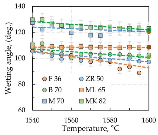 Figure 3 shows the temperature dependencies of the wetting angles at the 11 523 steel/ceramic substrate interface. The low-alloy 11 523 structural steel showed considerably weaker interaction than the high-alloy Mn steel on the refractory surfaces investigated. The most significant interaction occurred at the interface with the conventional F 36 fireclay material. In the temperature range of 1540–1600 °C, the contact angles ranged from 105° to 102°, while the lowest interaction was observed for the high corundum material MK82, where the contact angles in the same temperature range were 130°–123°. The values of the contact angles decrease slightly with increasing temperature as the sulfur content is less than 60 ppm [,].