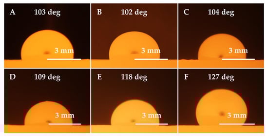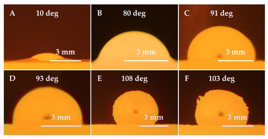 Images of XT 720 steel droplets wetting refractory ceramic substrates at 1500 °C; (A) F 36 ceramics, (B) ZR 50 ceramics, (C) B 70 ceramics, (D) ML 65 ceramics, (E) M 70 ceramics, and (F) MK 82 ceramics.
