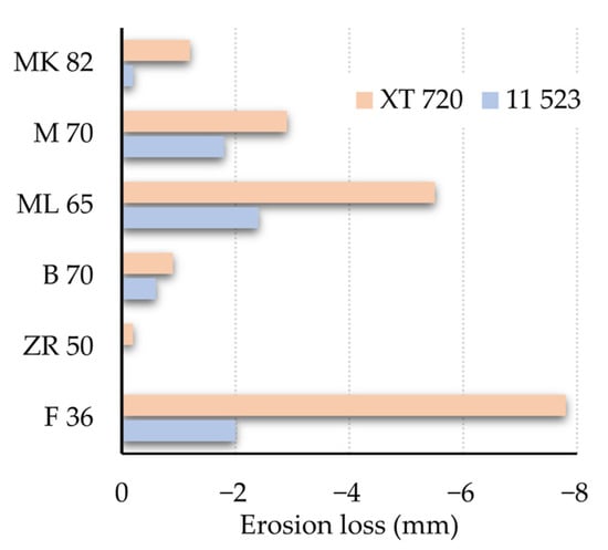 Figure 6 shows the degradation test results, i.e., losses of ceramics caused by high-manganese steel and low-alloy structural steel.