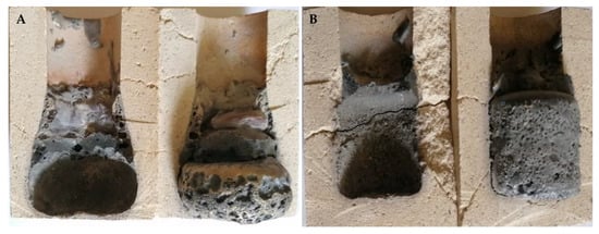 The type of steel used was found to greatly influence the degradation results of the refractories. Compared to conventional low-alloy structural steel, high-alloy manganese steel caused more significant wear to the materials tested. For this corrosive steel, the use of conventional fireclay materials proved to be entirely unsuitable. The most pronounced erosion loss interacting with this steel was observed for material F36, where even the crucible melted during the degradation tests (see Figure 7A). A more detailed discussion of the interaction is given in Section 3.3. The interaction rate of the steels with the refractory material decreases with increasing corundum content and decreasing silica and cristobalite content in the ceramics. The final state of the crucibles made from materials F36 and MK82 after degradation tests in interaction with XT 720 and 11 523 steels is shown in Figure 7A,B and Figure 8A,B.