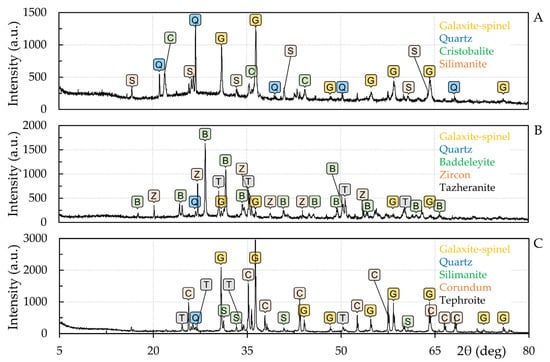 Diffractograms of refractory materials after high-temperature tests; (A) F 36 ceramics, (B) ZR 50 ceramics, and (C) MK 82 ceramics.