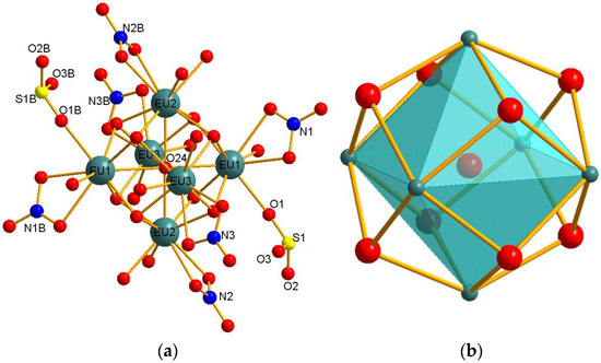(a) Coordination environment of the Eu(III) ions in compound 1; (b) hexanuclear Eu(III)-O clusters in compound 1. Symmetry codes: (A) −x + 2, −y+4, −z + 2; (B) −x + 3, −y + 4, −z + 1 (the C atoms and H atoms were omitted for clarity).