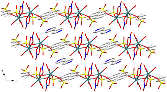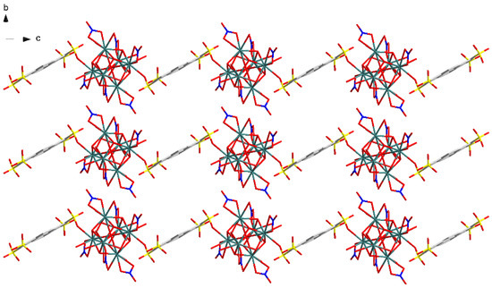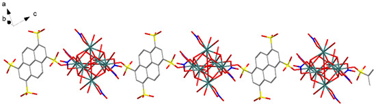 The spatial structure of compound 2 is formed by the stacking of pyrene tetra-sulfonic acid ligands in each layer through 4,4′-bipyridine molecules between layers, as shown in Figure 6. It can be speculated that 4,4′-bipyridine molecules play a template role in the synthesis of this compound.