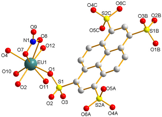 According to the single crystal X-ray diffraction data, compound 2 belongs to the triclinic P space group. As shown in Figure 4, each Eu(III) ion is coordinated with three oxygen atoms (O1, O2, and O4) from two sulfonic acid groups of 1,3,6,8-pyrene tetra-sulfonic acid ligands and three oxygen atoms (O10, O11, and O12) from coordinated H2O molecules, and is chelated by two oxygen atoms from one NO3− ion, showing an eight-coordinate configuration. For demonstrating the asymmetric unit in compound 2, an ORTEP representation is shown in Figure S3. A 2D layered structure is formed by the 1,3,6,8-pyrene tetra-sulfonic acid ligands connecting the Eu(III) ion nodes, as shown in Figure 5. The sulfonic acid groups of pyrene tetra-sulfonic acid ligands are coordinated with Eu(III) ions in two different modes. One is to connect one Eu(III) ion node in a η1 way, and the other is to connect two Eu(III) ion nods in the form of η2-μ2 mode. By simplifying the 1,3,6,8-pyrene tetra-sulfonic acid ligand to a four-connected node, the layered structure topology diagram of compound 2 can be obtained, as shown in Figure 5b. The Schläfli symbol can be expressed as (333 · 433).