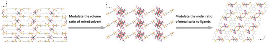 Metal–organic coordination polymers (MOCPs), or commonly known as metal–organic frameworks (MOFs) or metal–organic coordination networks (MOCNs) in some cases, usually refer to coordination compounds with a periodic extended infinitely in a one-dimensional, two-dimensional, or three-dimensional network structure formed by the coordination of bonds between metal ions and organic ligands. They have diverse and easily modified skeletal structures, and many of them also have a functionalized pore structure with large porosity and specific surface area. These intriguing features lead widespread applications including gas storage and separation, catalysis, fluorescence sensing, optoelectronics, magnetic materials, bioengineering, and so on [1,2,3,4,5,6,7,8,9,10,11,12,13,14,15]. In recent years, MOCPs have also received extensive attention as precursors and templates for the preparation of various kinds of derivatives, including nanostructured carbon; metal oxides (MOs); metal composites (M/MO@C); and other metal-containing compounds such as metal nitrides (MNs), metal carbides (MCs), and so on [16,17,18,19,20,21,22,23,24,25,26]. As the properties of MOCPs and even their derivatives are significantly affected by the MOCPs’ structures, it is crucial to have a fundamental understanding of the effects of synthesis conditions (e.g., temperature, solvent environment, pH, reagent concentration and molar ratio, the presence of counter ions, and template reagent, among others) for structure regulation [27,28,29,30,31].