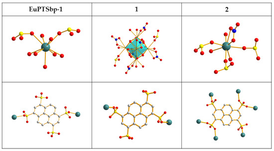 To regulate the crystal structure of the product, the volume ratio of mixed H2O/EtOH solvent was modulated to be 1:9 and the other reaction conditions including reactant ratio remain unchanged. The obtained compound 1 shows a 1D chains structure, which is similar to EuPTSbp-1 (Figure 7). The coordination modes of the PTS ligands in these two compounds are the same too. In this way, only two para-sulfonic acid groups are involved in coordination, who connects one Eu(III) ions in a η1 way, respectively (the second line in Figure 8). The main difference is the coordination environment of Eu(III) ions. As shown in Figure 8, for compound EuPTSbp-1, the Eu(III) ion is coordinated with nine oxygen atoms, two of which belong to sulfonic acid groups of PTS ligands and the other seven oxygen atoms come from coordinated H2O molecule. While the situation is different in compound 1, presumptively owing to the reduction of H2O content in mixed solvents, nitrate ionization becomes difficult in ethanol-rich solvents, leading to partially maintain chelated to Eu(III) ions and occupying two coordination sites. On the other hand, because of the strong coordination effect of hydroxide on rare earth ions [44,45], hydroxide and even O2− ions ionized from H2O molecules bridges with multiple Eu(III) ions in an efficient μ3 even μ6 bridging mode result to form an hexanuclear europium oxygen cluster nod, so that the relatively scarce hydroxides in ethanol-rich solvents can be fully utilized. As a rough estimate, each Eu(III) ion coordinates with seven H2O molecules in EuPTSbp-1, while six Eu(III) ions only share fifteen hydroxide or O2− ions ionized from H2O.