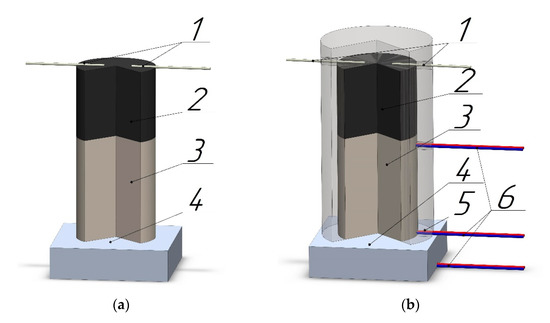 Experimental setups: (a) the experiment conducted without a CPPH; (b): with Ni-Al and Ti-C pellets located in CPPH: 1—ignitor, 2—Ti-C pellet, 3—Ni-Al pellet, 4—AlMg6 sheet, 5—CPPH, 6—thermocouples.