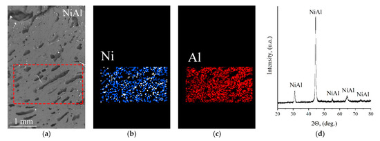 The intermetallic layer consisting of NiAl is a porous material (Figure 7) in which the pores generally have an elongated form with a length of 150–300 µm and a width of 30–100 µm. As a result of NiAl synthesis, a uniform distribution of Ni and Al was observed throughout the intermetallic layer (Figure 7b,c). The XRD results showed that this NiAl has a single-phase NiAl composition (Figure 7d).