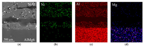 SEM image of NiAl-AlMg6 interface (a) and (b–d) EDS analysis maps showing the distribution of Ni, Al, and Mg.