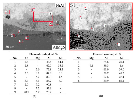 The joint interface between AlMg6 and NiAl had a straight-line appearance (Figure 9) with local diffusion layers (Figure 10). The NiAl structure had irregularly shaped pores and close to spherical ones (Figure 9b).