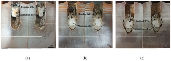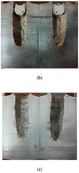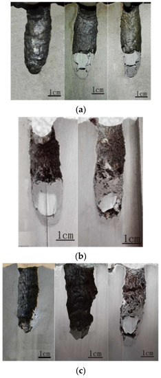 Longitudinal section of the craters penetrated by (a) Tungsten heavy alloy (WHA) rods, (b) WF/Zr-MG rods reinforced by Ø0.3 mm WFs, and (c) WF/Zr-MG rods reinforced by Ø0.7 mm WFs [31].