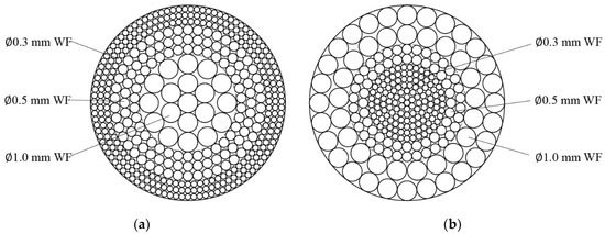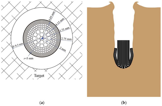 Compared with homogeneous materials, such as WHA and depleted uranium alloys, WF/Zr-MG has the advantage of designability. The volume fraction and diameter of WFs in WF/Zr-MG can be changed according to the requirements. In our previous penetration experiments, WF/Zr-MG reinforced by Ø0.3 mm, Ø0.5 mm, Ø0.7 mm, and Ø1.0 mm WFs rods exhibit different advantages and disadvantages in penetration. Figure 1 shows the experimental results of our previous research [31]. Compared with the WHA rod, the WF/Zr-MG rod reinforced by Ø0.3 mm WFs had the most stable penetration performance, and the WF/Zr-MG rod reinforced by Ø0.7 mm WFs had the deepest penetration depth. In order to make full use of the advantages and avoid the disadvantages of these WF/Zr-MG rods, two multi-diameter tungsten fiber reinforced Zr-based bulk metallic glasses matrix composite (MD-WF/Zr-MG) are designed. In MD-WF/Zr-MG-I, the diameters of WF increase gradually from the inside to outside. On the contrary, the diameters of WF in MD-WF/Zr-MG-II decrease gradually from the inside to outside. The cross section of MD-WF/Zr-MG schematic is shown in Figure 2.