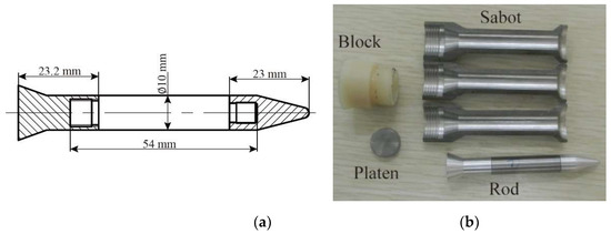 Figure 4 shows the MD-WF/Zr-MG rod and the assembly drawing of the projectile. The largest diameter of WFs in MD-WF/Zr-MG is Ø1.0 mm, so the rod with a diameter of 10 mm is prepared. In order to compare with the previous experimental results in reference [17], the rod with the same length is selected, so the length of the MD-WF/Zr-MG rod is set to 54 mm. A tail and a nose are installed in the bottom and top of the rod respectively to enhance the flight stability of the rod, as is seen in Figure 4a. Both the tail and nose are made of aluminum alloy to reduce their interference with penetration results. Since the diameter of the rod is less than that of the Ø25 mm smooth bore gun, a sub-calibre launching technique of a long rod is employed in the present paper. As shown in Figure 4b, the aluminum alloy sabots are used to fit the larger diameter of smooth bore for firing a smaller rod. A nylon block is used to push the projectile. A steel platen is placed between the rod and block to increase the strength of the block. Three rods of each material are manufactured. The mass of projectiles and rods are shown in Table 1. The target in the experiment is made of RHA with a thickness of Ø80 mm.