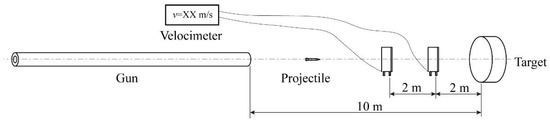 A Ø25 mm smooth bore artillery was used to launch the projectiles. The setup of the experiments is shown in Figure 5. The average impact velocities of rods between 2 and 4 m in front of the target are measured by a velocimeter. The speed range is also selected as in reference [17], which varies from 1470 to 1650 m/s.