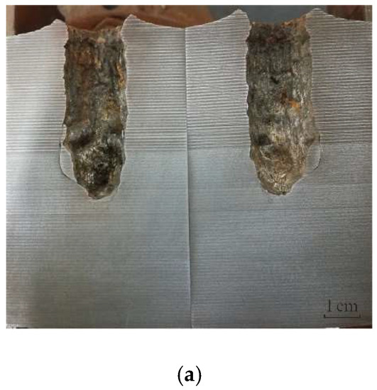 Figure 8 shows the external view of the residual MD-WF/Zr-MG-I rods. Figure 8a is a front view of the residual rod in Figure 7a. As shown in Figure 8a, Ø1 mm WFs is on the outside of the residual rod, and Ø0.3 and Ø0.5 mm WFs are on the inside of the residual rod, which is opposite to the original MD-WF/Zr-MG-I rod. Figure 8b is a magnified view of the residual rod in Figure 7b. Figure 8b reveals the reason why the Ø1 mm WFs in Figure 8a is on the outside of the residual rod. Figure 8b shows that the WFs at the head of the rod turn out layer by layer, which results in the arrangement of WFs in the residual rod is opposite to that in the original rod. Figure 8 proves that the WFs at the head of the rod bending and backflow during the penetration process. This penetration failure mode of the MD-WF/Zr-MG-I rod is different from the adiabatic shear failure mode of depleted uranium alloys. The penetration failure mode of the MD-WF/Zr-MG-I rod leads to a hemispherical head, which is similar to that of WHA [16,32].