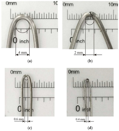 After 5 repeated tests, the bending test results of WFs are obtained. The test results of Ø1.0 mm WF is shown in Figure 10. Ø1.0 mm WF is not broken when its bending diameter is about 4 mm (Figure 10a), and Ø1.0 mm WF breaks when its bending diameter decreases to about 2 mm (Figure 10b). The test results show that the ultimate bending diameter of Ø1.0 mm WF is between 2 and 4 mm. Figure 10c,d show the test results of Ø0.5 mm and Ø0.3 mm WFs. Ø0.5 mm and Ø0.3 mm WFs are not broken during the bending test. According to the test results, the ultimate bending diameter of Ø0.5 mm WF is less than 0.6 mm, and the ultimate bending diameter of Ø0.3 mm WF is less than 0.4 mm.