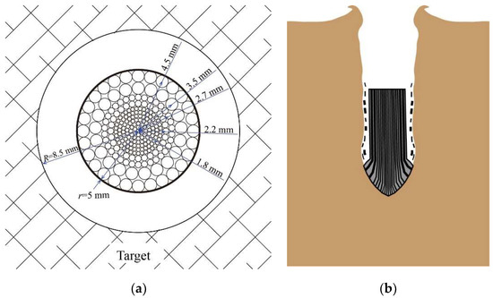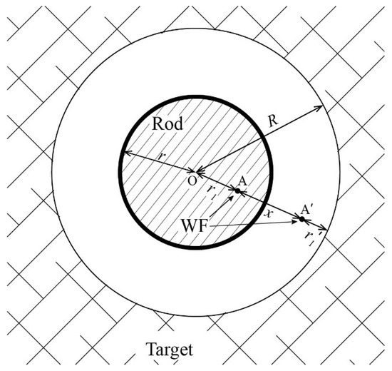 The cross-section diagram of the MD-WF/Zr-MG rod penetrating the target is shown in Figure 11. The radius of the crater is and the radius of the rod is . One WF at point “” in the MD-WF/Zr-MG, the distance between point “” and “” point (center of rod) is . If the WF can bend and backflow during the penetration process, its position in the crater will be “”. The distance between point “” and the wall of the crater is . Then the bending space of the WF is the distance between point “” and point “”.