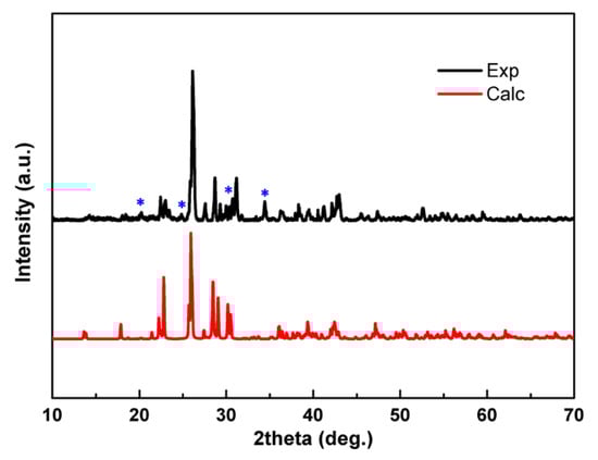 Figure 1 shows the XRD patterns of the synthesized Cs2Ca3(SO4)4 crystals. The black pattern represents the experimental powder XRD, and the red pattern represents the XRD calculated from the single-crystal structure. The experimental XRD pattern basically reflects that of our obtained compound, but with additional minor miscellaneous peaks (marked with asterisks in Figure 1), which led us to compare the XRD patterns of the raw reagents (Cs2SO4 and CaSO4) with the title compound. As shown in Supplementary Figure S1, the pattern of Cs2Ca3(SO4)4 is distinct from the patterns of the raw reagents, indicating that the additional peaks are caused by other compounds. Considering our previously reported compound, Cs2Ca2(SO4)3, was prepared using the same raw reagents, it is imperative that its characteristic peaks are properly distinguished from those corresponding to Cs2Ca3(SO4)4, newly synthesized here. In conclusion, the impurity peaks indicated in Figure 1 could be caused by Cs2Ca2(SO4)3 [14].