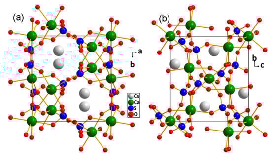Crystal data for Cs2Ca3(SO4)4 (M = 770.30 g/mol) are as follows: monoclinic, space group P21/c (no. 14), a = 9.9153(8) Å, b = 9.3760(6) Å, c = 9.8044(9) Å, β = 118.365(3)°, V = 802.04(11) Å3, Z = 2, T = 299(2) K, μ(MoKα) = 6.104 mm−1, Dcalc = 3.190 g/cm3, 9439 reflections measured (2.33° ≤ 2Θ ≤ 27.45°), 1635 of them unique (Rint = 0.0506, Rsigma = 0.0359), which were used in all calculations. The final R1 was 0.0438 (I > 2σ(I)) and wR2 was 0.0864 (all data). The fundamental building units of Cs2Ca3(SO4)4 were CaO6 octahedra and SO4 tetrahedra. These groups are interconnected by sharing vertex oxygen atoms to form a three-dimensional framework with large cavities filled by Cs+ cations (Figure 2). Each Cs+ cation is coordinated to eight oxygen atoms to form a CsO8 polyhedron, with Cs–O bond distances ranging from 3.026(5) to 3.354(5) Å (Supplementary Figure S2), because the next closest atom is not oxygen but sulfur, with a Cs–S bond distance of 3.6568(15) Å. The S–O bond lengths are in the range of 1.453(5)–1.478(5) Å and O–S–O bond angles vary from 105.4(4) to 112.3(3)°. Each Ca atom is bound to six O atoms to generate a CaO6 octahedron, with Ca–O bond lengths ranging from 2.276(5) to 2.526(5) Å. These bond distances and angles appear reasonable when compared with those reported for other sulfates [14,18,20].