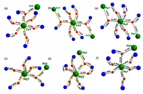 Connection mode between (a,b) Ca and S atoms in Cs2Ca3(SO4)4 and between Mg and S atoms in (c,d) Cs2Mg3(SO4)4 and (e,f) Rb2Mg3(SO4)4.