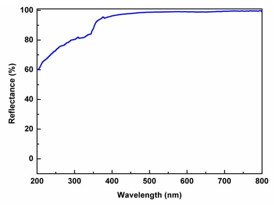 When light is projected onto a rough surface, it is reflected in all directions, which is referred to as diffuse reflectance. The measured UV–vis–NIR diffuse reflectance spectrum is depicted in Figure 4. Apparently, the reflectance of Cs2Ca3(SO4)4 is close to 100% in the wavelength range of 400–800 nm and higher than 60% in the range of 200–400 nm. Although the synthesized samples had low levels of Cs2Ca2(SO4)3, this impurity exhibited a higher reflectance than our measured value and, thus, the measured spectrum essentially shows reflectance due to Cs2Ca3(SO4)4. Therefore, it can be inferred that the energy band gap is greater than 6.2 eV, suggesting that Cs2Ca3(SO4)4 has a wide UV light window of penetration and may have a potential application as a window material.