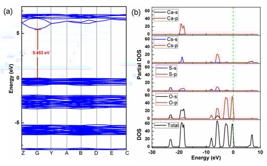 Electronic structures can be used to verify diffuse reflectance spectra and understand the origin of optical properties. The energy band structure calculation demonstrates that the title compound exhibits a large band gap of 5.453 eV. Although the calculated value is slightly smaller than the experimental one, it basically verifies that Cs2Ca3(SO4)4 has a high reflectance in the UV region (Figure 5a). The total density of states (DOS) and partial DOS are shown in Figure 5b. In the energy region from −20 to −15 eV, the contribution of Ca-3p, Cs-5s, S-2p, and O-1s states dominates (Figure 5b). In the energy range from −10 to −5 eV, the DOS is mainly composed of Cs-6p, S-2p, and O-2p states. In the energy range from −5 to 0 eV, only O-2p states contribute. In the energy range from 5 to 10 eV, Cs-6s and Cs-6p states take up most of the DOS, while the contribution from S, O, and Ca elements gradually decreases. As we know, the optical absorption edge is closely related to the energy band gap determined by the states around the Fermi level [28]. From the above analysis, in the range of −5 to 10 eV, the elements S, O, and Cs make the largest contribution and, thus, determine the energy band gap of the title compound. In other words, SO4 groups and Cs+ cations represent the main contribution in determining the optical properties of Cs2Ca3(SO4)4.