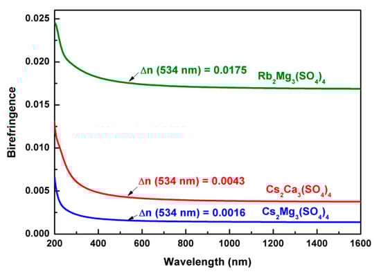 Calculated birefringence for Cs2Ca3(SO4)4, Cs2Mg3(SO4)4, and Rb2Mg3(SO4)4.