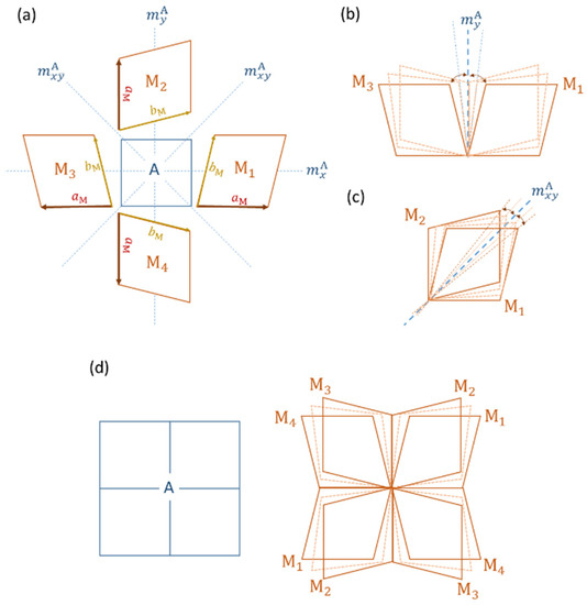 A 2D example of a square austenite (A) → parallelogram martensite (M) transformation. (a) There are four orientation variants, assuming for the “natural” OR. (b) Closing-gap OR and associated rotation gradients between the variants and . This new OR maintains invariant the vertical reflection plane . (c) Closing-gap OR and associated rotation gradients between the variants and . This new OR maintains invariant the diagonal reflection plane . (d) Global compatibility between the variants mediated by the closing-gap ORs and associated orientation gradients.
