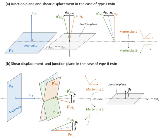Junction plane between variants and deduced from the austenite symmetry operation that links them. (a) Reflection on the austenite plane , and (b) 180° rotation around the austenite axis .