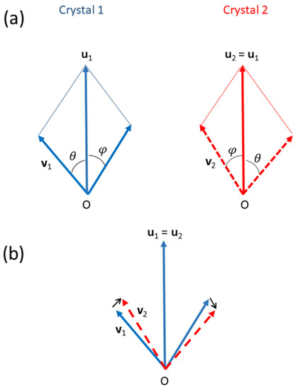 This plane is inherited from a parent plane whose normal vector is represented in dashed blue in Figure 2b. The knowledge of this vector is not important; we just need to know that it is transformed into a reciprocal vector of the variant , . The vectors and are in inter-correspondence, i.e., . The reciprocal shear direction is . Here, again, one has to keep in mind that, in this equation, is written in and in . Let us write all the terms in . The first term is not changed. The second term is not changed either when written into the basis of because it represents a plane that is normal to the rotation axis. It becomes that the reciprocal shear direction written in is . This vector can be rewritten in by taking its opposite. This reciprocal vector is the shear plane in the direct space, which is also the junction plane between the two variants. We can write it as