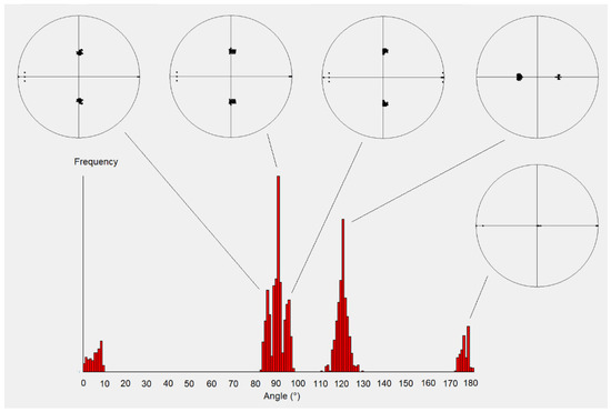 Let us come back now to the case of two variants linked by a parent symmetry that is not two-fold, for example, for the three-fold rotation symmetry . The rotation axis of this symmetry should be tilted by the natural lattice distortion, but we assume that it is actually maintained unrotated thanks to the additional rotation gradient. It is transformed into . The possible weak planes and associated weak twins of the axis are calculated by GenOVa, and only those whose correspondence matrix are equal to the inter-correspondence matrix between the two variants are considered. Depending on the tolerances used to determine the directions and (Figure 3), different weak planes are predicted. Those associated with the lowest tolerances are ranked in the first positions. It will be shown that, in the case of NiTi alloys, the predicted “weak” junction planes agree well with the experimental TKD maps.