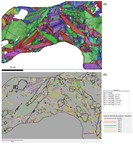 - Trimby, T. Orientation mapping of nanostructured materials using transmission Kikuchi diffraction in the scanning electron microscope. Ultramicrosc 2012, 120, 16–24. [Google Scholar] [CrossRef] [PubMed]