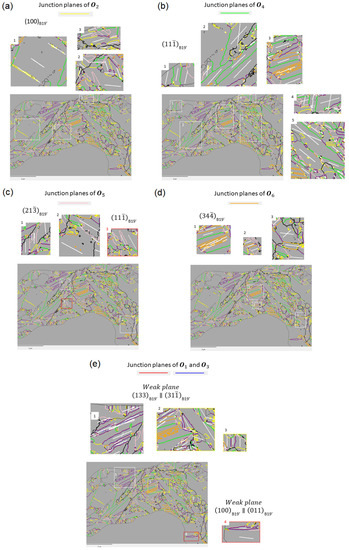 We have acquired various TKD maps and analyzed the traces of the junction planes with ARPGE, as explained in Section 5. Here, in Figure A1, we show another TKD map where the grain boundaries between the B19′ variants are colored according to the operators rather than link them. The comparison of the traces with the predictions of the correspondence theory on different zones of the maps is shown in Figure A2. The agreement is satisfying, except for some boundaries between variants linked by the polar operators.