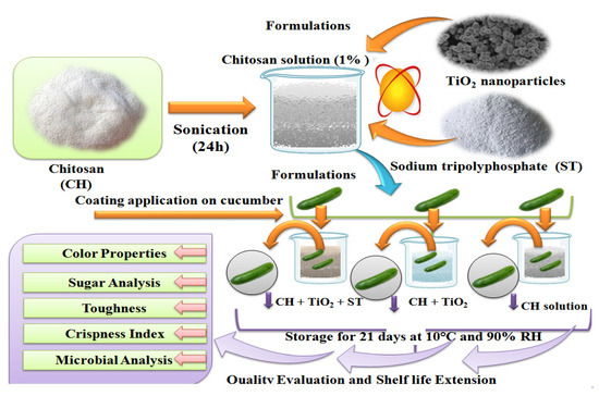- The fourth group (CH-Nano-ST) was coated with a combination of chitosan, nano titanium oxide crystals, and sodium tripolyphosphate as a crosslinker among nanoparticle polymers. Figure 1 presents the formulations, coating application on cucumber samples, and quality evaluation and shelf-life extension.