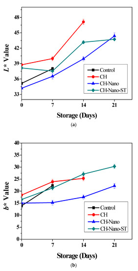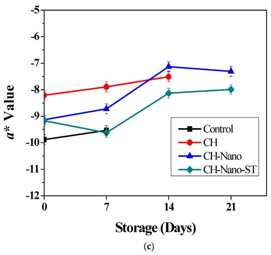 Color is one of the significant signs of cucumber quality and influences customer acceptance during storage [34]. On the day of preparation, the lightest treatment was CH followed by CH-Nano-ST and CH-Nano, while at the end of 21 days, CH-Nano remained the lightest with 44.38 and CH-Nano-ST was a little darker (43.73) than the others, which had some signs of spoilage and aging on cucumbers; Figure 2a. As presented in Figure 2b, discoloration was detected in all treatments due to the transformation of chlorophyll into carotenoids. The discoloration was extra severe with control 22.3, which started to spoil after the end of the first week. After the 14th day, in CH samples, a little higher value of b* (value 25.31) was detected, then it had some signs of spoilage, demonstrating a color difference, compared with those coated with nano-materials. Chitosan coatings have been applied by several researchers to delay color change [35,36].CH-Nano and CH-Nano-ST treatments had the lowest values after 21 days of the storage period, 22.19 and 30.3, respectively. In terms of greenness a* value, CH-Nano-ST retained the maximum greenness (−7.99) compared to CH-Nano samples, which recorded −7.31; Figure 2c. Overall, coating with nano-materials promoted the preservative properties and inhibited yellowing in the peel of cucumber samples. That may be due to the ability of chitosan and nano titanium oxide crystals to retard the degradation of chlorophyll by slowing metabolism in the cucumber peel [24]. Nano titanium oxide crystals reduced the conversion of chlorophyll to yellow-olive-colored pheophytin [37].