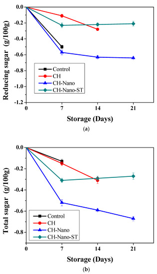 The rate of change of reducing sugars and total sugars of cucumber samples stored for three weeks at 10 °C is presented in Figure 3a,b. Control and CH samples were soiled after the 7th and the 21st days of the whole storage, respectively. After 21 days of the storage period, the reducing sugar content reduced to reach −0.64 g/100g and −0.21 g/100 g for CH-Nano and CH-Nano-ST treatments, respectively. Parallel changes were detected in total sugar contents, which reached −0.66 g/100 g and −0.26 g/100 g for CH-Nanoand CH-Nano-ST treatments, respectively. The presence of sugar in the stored cucumbers is a vital index due to its benefit for health [24,38].