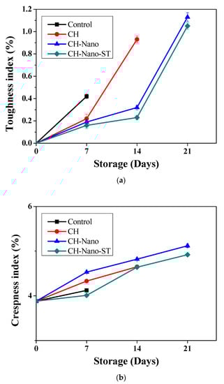 The texture properties such as toughness and crispness indexes of treated cucumber samples during storage at 10 °C are presented in Figure 4a,b. The CH-Nano-ST treatment presented a lower value of 1.05 for toughness, followed by CH-Nano (1.13%) at the end of the storage period. Cucumbers with CH treatment had the toughest skin (0.93%) after the 14th day, followed by CH-Nano (0.32%); Figure 4a. Control samples showed the highest toughness value on the seventh day of storage, with signs of ageing and spoilage from then until the end of the storage period. Generally, CH-Nano-ST treatment positively affected the cucumber texture, which had softer and extra tender skin.