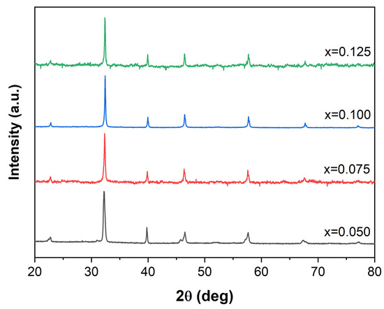 The X-ray diffraction patterns of the studied (1−x)(0.8NBT-0.2BT)−xCT compositions confirm pure perovskite structure. Splitting of pseudocubic [200] maximum for the composition x = 0.050 at 2θ = 46° is seen, while at higher CaTiO3 concentrations, no deviations from the cubic pattern were detected (Figure 1).