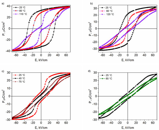 Polarization hysteresis loops for all studied compositions at bipolar electric field pulses at various temperatures are shown in Figure 2. Well-expressed double hysteresis loops for the compositions x = 0.050 and x = 0.075 are observed in the region of Td. Signs of a double hysteresis loop at room temperature region are also observed for the composition x = 0.100, while P(E) for the composition x = 0.125 is almost linear.