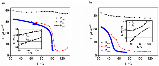 Temperature dependences of remnant polarization Prem(T) for the compositions which are in the ferroelectric phase at room temperature (x = 0.050, x = 0.075) are presented in Figure 3. The dependences were determined in two ways: (1) calculated from measurements of static pyroelectric effect, and (2) extracted from bipolar hysteresis loops at different temperatures. In both cases, Prem(T) decreases if temperature is increased, but, in the case of static pyroelectric effect, this dependence is more expressed. The abrupt drop of Prem(T) around 100 °C for the composition with x = 0.050 and around 40 °C for the composition with x = 0.075 indicates the region of depolarization temperature Td.