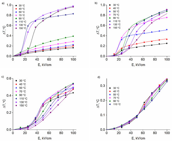 Electric field dependences of ΔT for all studied compositions at different temperatures are shown in Figure 5. For the composition with x = 0.050 (Figure 5a), at measurement temperatures up to 90 °C, where the composition is in the ferroelectric state, ΔT is low across the whole electric field E range, with weakly negative curvature of ΔT(E). Above this temperature range, ΔT(E) contains significant contribution from the jump, which is observed in the vicinity of the critical electric field Ec and corresponds to the entropy jump (∆SPT) characteristic for the first-order phase transition: