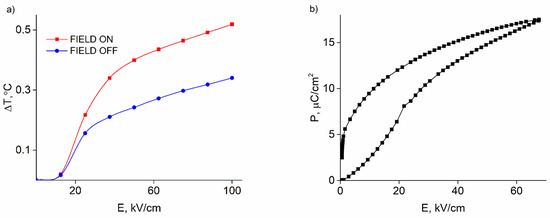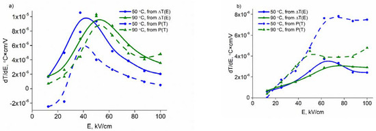 Examples of comparison of the results obtained by the direct and the indirect methods are presented in Figure 8. In the case where ΔT(E) has a clear enough inflection point, the shapes of curves representing the left and the right side of Equation (3) mutually correlate. However, the differences between these values can be significant. If the inflection point is not as pronounced (maximum of dT/dE as a function of E is low), even the shapes of the two curves do not correlate. This might partly be explained by rather flat P(T)E dependence in this case (low values of accordingly) when any additional contribution to polarization can seriously influence the values of . From another point of view, as it was assumed above, the expressed inflection point could reflect at least a partial phase transition between nonpolar and ferroelectric phases, which could present a more appropriate case for using the Maxwell equation rather than rearrangement of polarization in the nonpolar phase clearly representing the relaxor state.